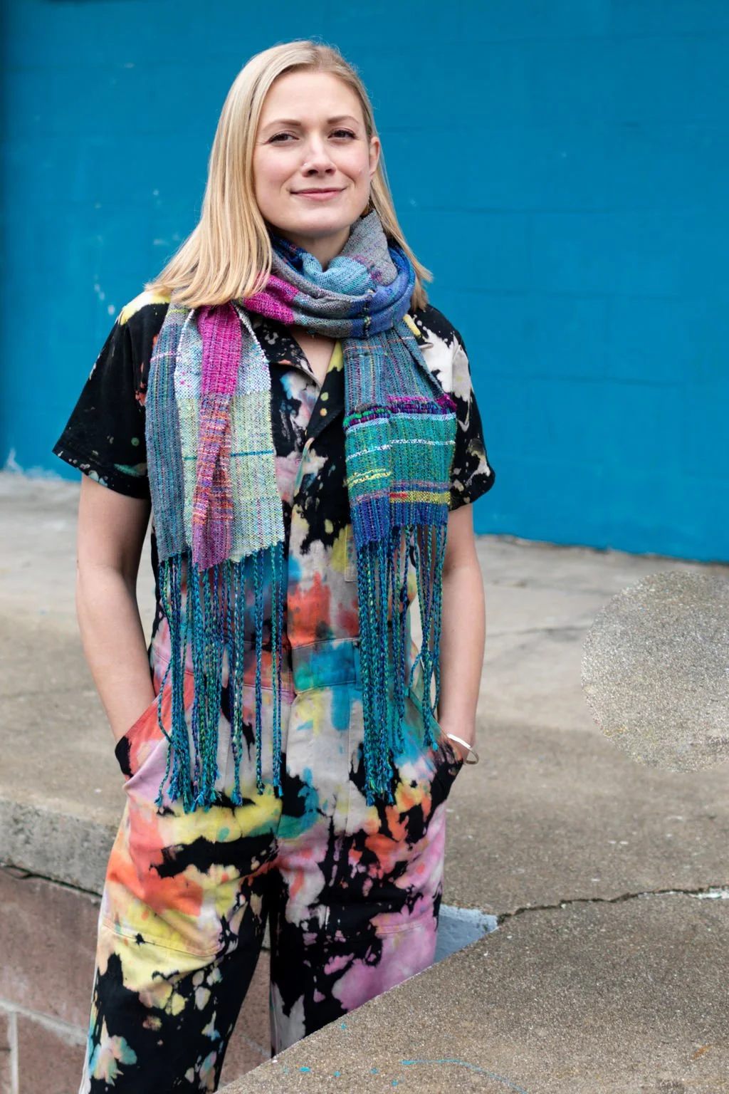 My paintings are created on wood panels without the use of brushes. I hand weave fiber artwork on my Saori floor loom.